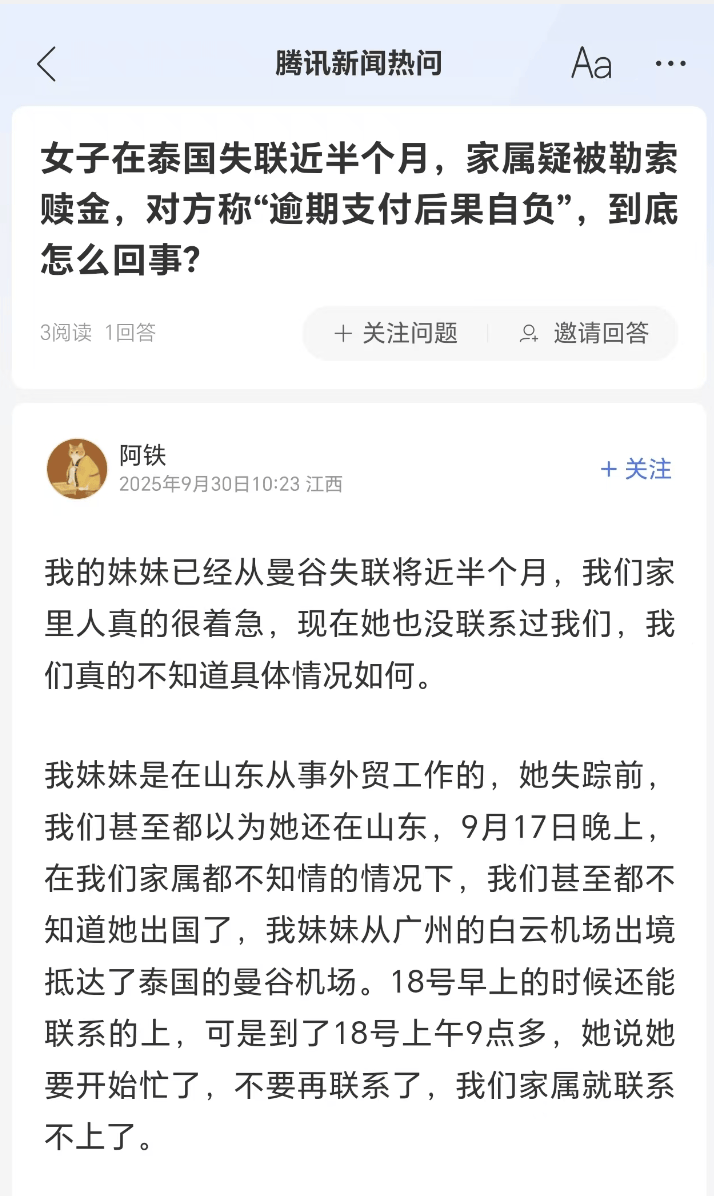 最近,一篇文章“失去了与我在曼谷的姐姐接触,自18日以来就一直没有与她联系”,引起了广泛的互联网关注。失落的女人的堂兄曾经与腾讯新闻讲话。 ▲9月30日,失落的女人失落的表亲在腾讯新闻热门问题上发表了讲话,Xiaoxiang Morning News的记者联系了Pei女士,Pei女士告诉记者,与曼谷失去联系的男人是他的cousin Xu Yating。 “他买了一张往返机票,他可能不知道自己永远不会回来。”失踪男子Xu Yating的堂兄告诉记者,他的姐姐英语很好。在他出来之前,他与山东的一家外贸公司与外贸工作相关,这次他去了班克克(Bankk),只是要求该公司休假。 “我听说这次我要翻译合同,但我不知道细节。”佩女士对记者说。根据家人提供的信息在微信中名为“ Abing”的人与Xu Yating的家人接触,是Xu Yating University的同学。在此时Xu Yating失踪后,全家也从“ Abing”获得了消息,发现他已经飞往泰国曼谷。甚至Xu Yating的空中票信息也被传达给了“ Abing”的家人。他说,空中票的信息是由Xu Yating发送给他的,一家人非常贫穷 - 对此很疑问。 ▲“ bing”发送给家庭发送的空气票轮换信息扩展了全文